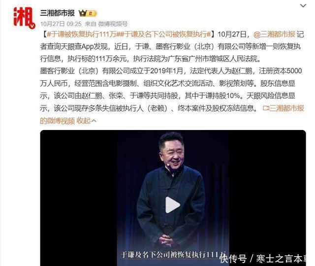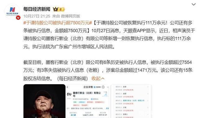 官方通报,于谦占股公司被恢复执行111万